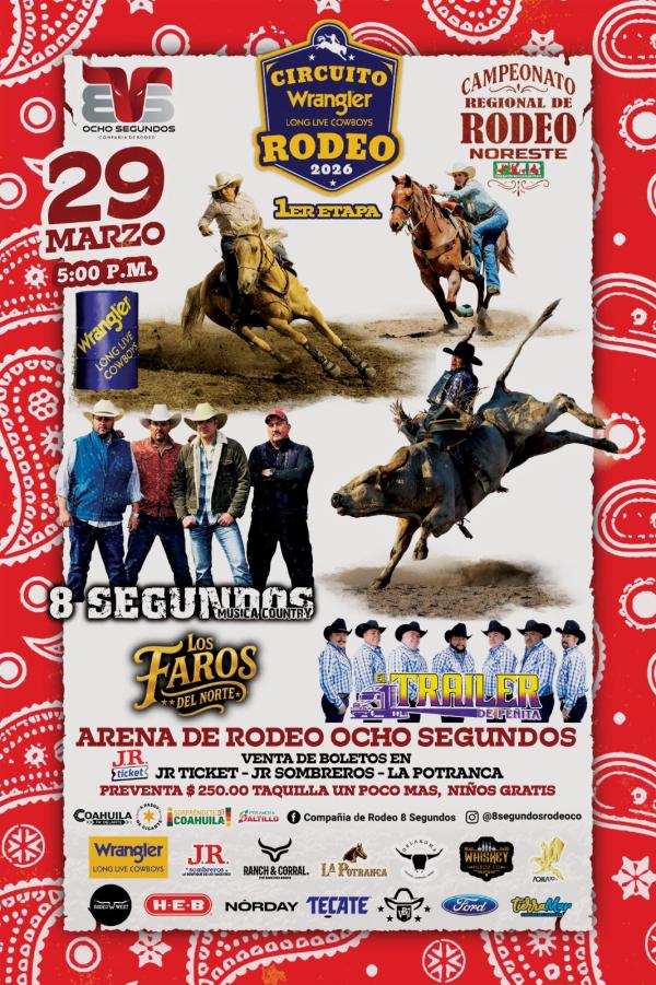 Descripción:🤠🔥 ¡SE PRENDE EL RODEO! 🔥🤠 Llega la 1ra Etapa del Circuito de Rodeo Wrangler 2026 dentro del Campeonato de Rodeo Noreste FMR, con los mejores jinetes y toda la adrenalina del rodeo en vivo. 📅 Domingo 29 de marzo 🕔 5:00 PM 📍 Arena de Rodeo 8 Segundos 🐂 Montas de alto nivel, ambiente vaquero y mucha fiesta. 🎶 En vivo: • 8 Segundos • Los Faros del Norte • Tráiler de Peñita Prepárate para vivir una tarde llena de adrenalina, música norteña y el verdadero ambiente de rodeo. ⚠️ No te quedes fuera, será una noche que va a hacer temblar la arena. 🎟 Consigue tus boletos y asegura tu lugar.